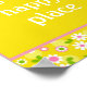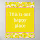 El poster luminoso y soleado presenta un patrón retro de flores blancas con centros rosas y verdes sobre fondo amarillo. Cuadro de texto amarillo central con el personalizable "Este es nuestro lugar feliz"