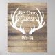 Poster rústico estilo casa de campo "Be Our Guest" con fondo de tablones de madera y cantos de ciervos blancos. Enmarcar y escribir su contraseña de WiFi en el cristal con un marcador de borrado seco!