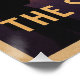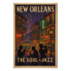 Afiche de viaje retro de Nueva Orleans, EEUU. Calle animada del barrio francés por la noche, con carteles de neón brillantes, balcones de hierro forjado con plantas colgantes y farolillos cálidos. En primer plano, una silueta de jazz toca la trompeta, el saxofón y la trombona.