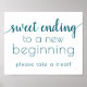 Lujosos carteles turquesa azul acuático, aguamarina, marinero y blanco horizontal "Sweet Ending to New Beginning" ducha, fiesta o carteles de la mesa de recepción con un divertido y casual guión con letras a mano. El diseño clásico incluye un moderno superpuesto de tipografía con letras a mano. El bonito tipo de letra con un color de fondo de personalizable facilita la adaptación a cualquier tema. Para otros colores o productos a juego, por favor visite la tienda JustFharryn Zazzle, o contacte con el diseñador, c/o fharryn@yahoo.com Todos los derechos reservados. #zazzlemade
