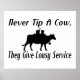 Sí, he tenido muchas vacas que me traen comida y bebida y nunca vuelven a ver si necesito algo más. ¡Nunca le des una propina a una vaca porque dan un mal servicio! Con una vaca con campana puesta, llevando comida y bebida sobre una bandeja en la espalda.