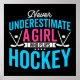 El texto de rosa caliente, azul brillante y blanco con pollas de hockey y palos de hockey dice Nunca subestimar a un Chica que juega al hockey, ¡genial para el jugador de hockey de todas las edades que ama el deporte!