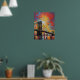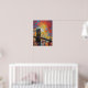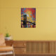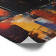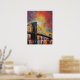 Este colorido poster presenta una imagen abstracta de una puesta de sol sobre la ciudad de Nueva York con el puente y el agua en primer plano. La impresión está en tonos amarillos, naranjas y rojos, con algunos tonos azules y violetas. Este poster sin marco está disponible en una variedad de tamaños que se ajustan a los marcos estándar.