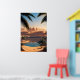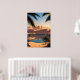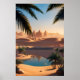 El cuadro representa un paisaje desierto sereno con un vibrante oasis azul en primer plano. Las palmeras rodean el paisaje, su frondosa vegetación contrasta con las cálidas dunas de arena. El cielo es azul suave, lo que indica un ambiente tranquilo y tranquilo. A lo lejos, un grupo de formaciones rocosas se eleva, añadiendo un sentido de misterio y grandeza al paisaje.