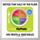 Muestra tu lado de dieta irracional y nutrición con este poster con el logo de MyPlate así como el dicho "Observe que la mitad de la placa son frutas y verduras". Nota: Este poster que incluye el logotipo de MyPlate no está respaldado ni apoyado por el Departamento de Agricultura de los Estados Unidos.