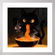 In the warm glow of a mysterious night, a sleek black cat with hypnotic golden eyes dangles a bold little mouse above a bowl of radiant ramen. While the fearless mouse slurps a glowing orange noodle, the cat watches in fascination, creating a moment where rivalry and appetite collide in magical harmony. This artwork isn’t just a culinary scene—it’s a celebration of courage, humor, and the unexpected joys that light up ordinary moments.