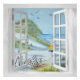 White open window with sheer curtains and child walking on beach dune watercolor artwork.