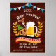 Invitación al festival de cerveza Oktoberfest con una taza de cerveza, pretzel, salchicha, una bandera con los colores de la bandera alemana, banderas bávaras en la parte superior para celebrar la fiesta de Oktoberfest en otoño.