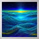 Hermosas olas espumosas azules con puesta de sol amarilla y estrellas en el cielo nocturno.