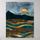 Un cautivador poster paisajístico abstracto con olas doradas y verde azuladas en capas que atraviesan el primer plano, en contraste con las montañas oscuras y las texturas plateadas. Un sol dorado resplandeciente se eleva (o se pone) detrás de los picos, creando una atmósfera serena y mística. Las ricas texturas de Relieve metalizado, purpurina y superficies de mármol aportan profundidad y elegancia, lo que hace que este diseño sea perfecto para los amantes de los estilos modernos, inspirados en la naturaleza y lujosos.