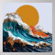 Representación artística de las olas del océano con tonos azules vivos y un sol dorado prominente en el fondo. Las olas están texturadas, con salpicaduras de espuma blanca y toques de rojo y oro, creando un aspecto dinámico y abstracto.