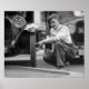 Vieja foto de un hombre señalando el neumático en un auto antiguo con matrícula Washington D.C., 1922.