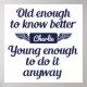 “Old enough to know better, but young enough to do it anyway”. See my store for more items with this design.