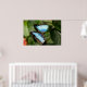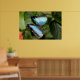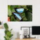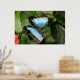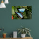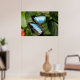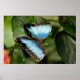 A vibrant blue butterfly rests delicately on a lush green leaf, its wings spread widely to display their iridescent hues. The surrounding foliage provides a natural and serene backdrop, enhancing the butterfly's striking coloration.