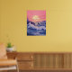 Una impresionante capa marina bañada por el suave resplandor de un sol que se pone. El océano azul profundo se hincha con olas dinámicas que chocan contra rocas encapuchadas, mientras que el cielo está pintado en tonos rosa y violeta. Esta composición de ensueño captura el equilibrio entre la potencia cruda del océano y la belleza tranquila del crepúsculo.