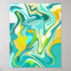 Este diseño contiene un patrón abstracto con formas onduladas y onduladas en brillantes tonos turquesa, verde azulado, amarillo y verde. La composición sugiere un sentido de movimiento y energía, evocando elementos naturales como olas oceánicas o agua fluida.
