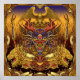 Máscara de enano potente, con cuernos, rodeada de leones alados, un águila majestuoso y elementos decorativos ornamentales. La máscara oni está adornada con detalles intrincados y tiene una expresión feroz y amenazante.