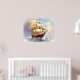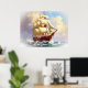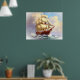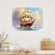 A majestic sailing ship with billowing white sails navigates through a lively sea under a sky dotted with fluffy clouds. The vessel's detailed structure contrasts beautifully with the vibrant blue of the ocean and sky.