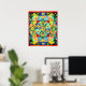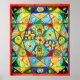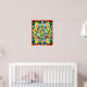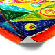 Los patrones geométricos vibrantes llenan la imagen, con círculos, triángulos y remolinos en un calidoscopio de colores que incluyen azul, verde, amarillo y rojo. El diseño intrincado crea una sensación de simetría y equilibrio.