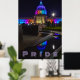 Una fotografía nocturna captura el ayuntamiento de San Francisco bañado en vivos colores arcoiris. La icónica cúpula, adornada con la bandera del orgullo LGBTQ+, se destaca contra el cielo oscuro. La fachada del edificio está iluminada con una gama de colores que crean una pantalla deslumbrante. En primer plano, una piscina reflectante refleja las luces de colores, lo que aporta un toque sereno y etéreo a la escena.