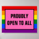 "Orgullosamente abierto a todos" dice el mensaje Open to All (#OpenToAll) que tu negocio o casa puede mostrar para mostrar que la homofobia y la intolerancia no tienen lugar en tu negocio o tu vida. También disponible como poster si quieres asegurarte de que todos tus clientes, vecinos y la comunidad sepan que la comunidad LGBTQ es bienvenida. Muestra tu apoyo a la comunidad LGBTQ todo el año, no solamente durante el Orgullo.