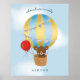Póster personalizado y adorable para habitación de nursery o de niños que presenta una ilustración de un osito de peluche marrón montando un globo aerostático azul y amarillo que sostiene un globo rojo. Hay banderas de purpurina plateada falsa alrededor del globo aerostático. El texto de arriba dice "la aventura espera". Personalice este producto agregando el nombre de su hijo en la parte inferior. Ideal para un niño.
