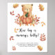 ¡Celebra con este fiesta de ducha de bebé con temática de oso de peluche! Watercolor lindo oso de peluche con una calabaza de otoño en sus patas se sienta en el follaje de otoño. Elementos coincidentes disponibles.