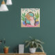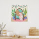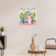 Una ilustración adorable de un oso de peluche durmiendo en un sillón antiguo con macetas de plantas y flores