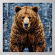 Obra de arte vibrante que representa un oso con un rico abrigo de piel texturizado, colocado sobre un fondo de patchwork con tonos azules y grises. El oso se mantiene imponente y realista, captando la atención con sus características realistas.