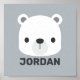 Este diseño incluye un oso polar adorable con nombre personalizado en un estilo de fuente gris moderna y minimalista sobre un fondo gris claro.