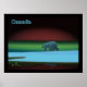 Un oso polar deambula por el hielo durante la larga noche polar; las auroras boreales en rojo y verde brillan a lo lejos. También aparece texto que dice "Canadá" en azul brillante y blanco.