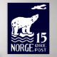 El sello postal de Noruega 15 Ore Air Mail de 1925. El sello incluye un oso polar en una capa de hielo observando a un avión repartiendo el correo. Este diseño está disponible en azul oscuro, blanco y azul claro.
