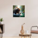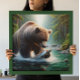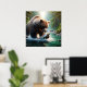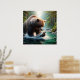 Una pintura que muestra a un oso y a un pez entremezclados con gracia en un río. El oso se está acercando a los peces mientras sube elegantemente contra la corriente, creando una escena armoniosa y cautivadora.