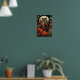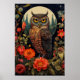 Poster with a cool looking owl with a piercing stare. A full moon in the back with a garden of red flowers.