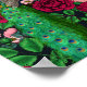 Patrón dibujado a mano con pavos reales y varios rosas sobre un fondo oscuro