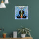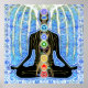 Belice su estudio de yoga o sala de meditación con esta visualización que muestra los chakras y el sushumna [ida y pingala] sobre la silueta de una persona meditadora, flotando en un radio de pulsos de aura azul, turquesa y blanca. Alta resolución, detalle extremo, funciona en todos los tamaños.