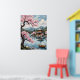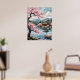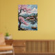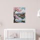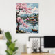 Este cuadro representa un paisaje japonés sereno con un edificio tradicional de estilo pagoda situado a orillas de un lago tranquilo. Un gran y hermoso árbol de flores de cerezo con flores rosadas vibrantes rodea el lado izquierdo de la escena. La pagoda y las montañas se reflejan en el agua tranquila, donde un pequeño barco está amarrado cerca de la orilla rocosa. La obra de arte tiene una textura rica y pintoresca con pinceles visibles, lo que le da una estética apacible y clásica.