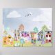 Poster paisajístico de la casita. Aldea de casas con un estilo naïf. Una gran adición a la decoración de las paredes, para una habitación infantil o un vivero, o cualquier habitación de la casa.