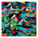A.I. creó la interpretación de una vibrante composición geométrica de paisaje cubista que representa picos estilizados de montaña y árboles en una audaz gama de colores.