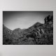 Un paisaje blanco y negro con grafitis en las rocas.
