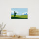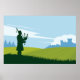 Un poster gráfico con un ilustracion de un paisaje escocés con un hombre de silueta en un horno tocando gaitas, parado en una colina en medio de un campo verde. El fondo contiene un castillo y árboles y pocas nubes en el cielo. Este arte mural será perfecto para decoración en casa o oficina.