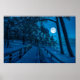 Paisaje invernal con pinos cubiertos de nieve y abetos a la luz de la luna en noche estrellada con luna llena. Vista del bosque de coníferas con sendero de madera cerca de la costa del mar con hermoso cielo nocturno con estrellas.