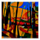 A.I. La impresión asistida de formas geométricas vívidas en colores audaces de otoño crea un paisaje cubista dinámico entre rocas y árboles en forma abstracta.