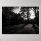Una foto en blanco y negro de tono cálido tomada entre los árboles de Bute Park Cardiff en una soleada tarde de noviembre, el sol de otoño en el cielo brilla a través de los árboles que arrojan largas sombras y dramáticas siluetas.