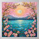 Un paisaje sereno realzado por colores vivos y detalles complejos. En el centro, una luna llena resplandece suavemente contra un cielo pastel, pasando del rosa al melocotón. El flanco de la luna son montañas lejanas, lo que añade profundidad a la escena. En primer plano, los cerezos florecientes con delicadas flores rosadas enmarcan la imagen, sus ramas riéndose con gracia. El agua de la parte de abajo refleja los colores del cielo, reflejando el ambiente tranquilo, mientras que los acentos dorados, que representan la luz del sol, aportan un toque de calidez y luminosidad. En general, la imagen evoca una sensación de paz y belleza natural.