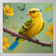 Un pájaro amarillo colorido con acentos azules y verdes descansa en una rama en medio de un follaje vibrante y mariposas brillantes.