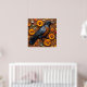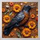 Los girasoles brillantes y las semillas texturadas crean un fondo que muestra un pájaro negro y naranja en una composición decorativa. Este arreglo artístico refleja colores vivos y la belleza de la naturaleza en una presentación creativa.