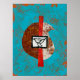 Ilustracion de pájaro divertido sobre una forma de color marrón y beige con un centro de caída naranja - todo sobre un fondo turquesa y naranja texturado.