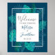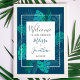 Bienvenidos a sus bodas invitados con este poster botánico azul verde y moderno decorado con follaje silvestre y hojas de palma. Un precioso signo tropical además de una ceremonia de verano al aire libre o una boda de destino de isla en una playa hawaiana.