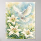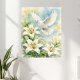 Este pacífico arte mural en acuarela presenta una paloma blanca volando sobre lirios florecidos, simbolizando esperanza, paz y nueva vida en Cristo. Sin texto, esta obra de arte es perfecta para decoración de hogar inspirada en la fe, espacios de oración, habitaciones de bebé, o como un suave recordatorio de la presencia de Dios durante la primavera y la temporada de Pascua. Una hermosa impresión de arte cristiano para exhibir o regalar.